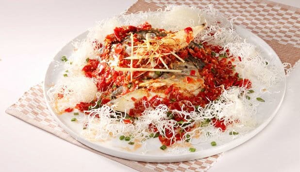 将拌匀的红辣椒材料铺满与挪威三文鱼头上,以摄氏100度蒸15分钟。
